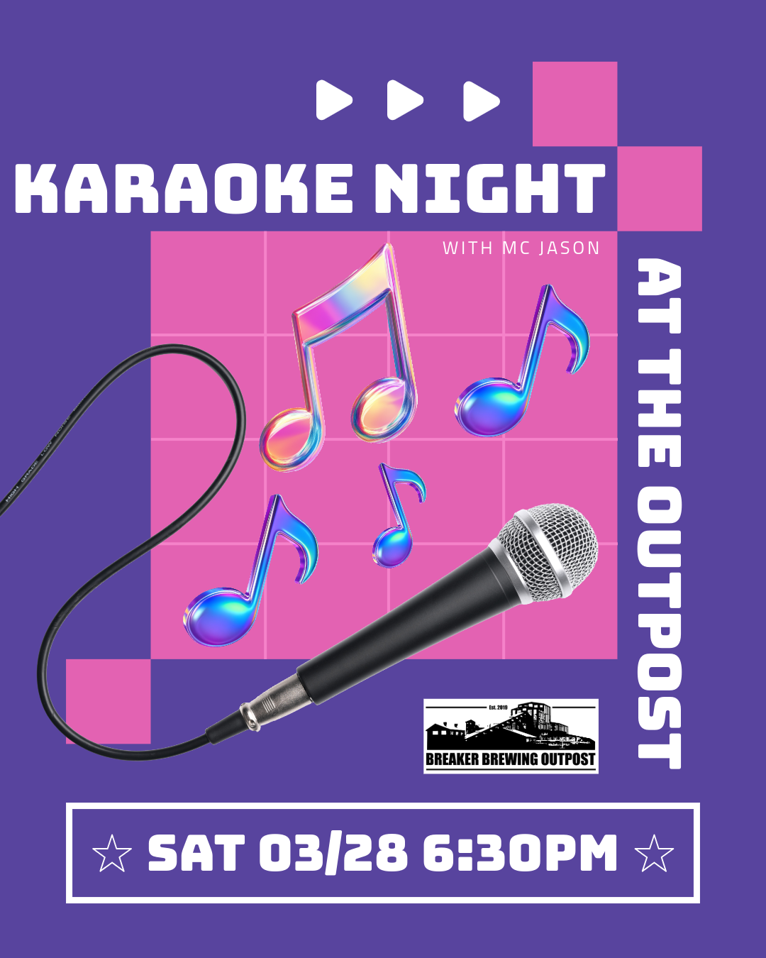 Don’t miss out on Karaoke Night, Saturday, 03/28, at The Outpost starting at 6:30pm until 9:30pm with your host MC Jason.