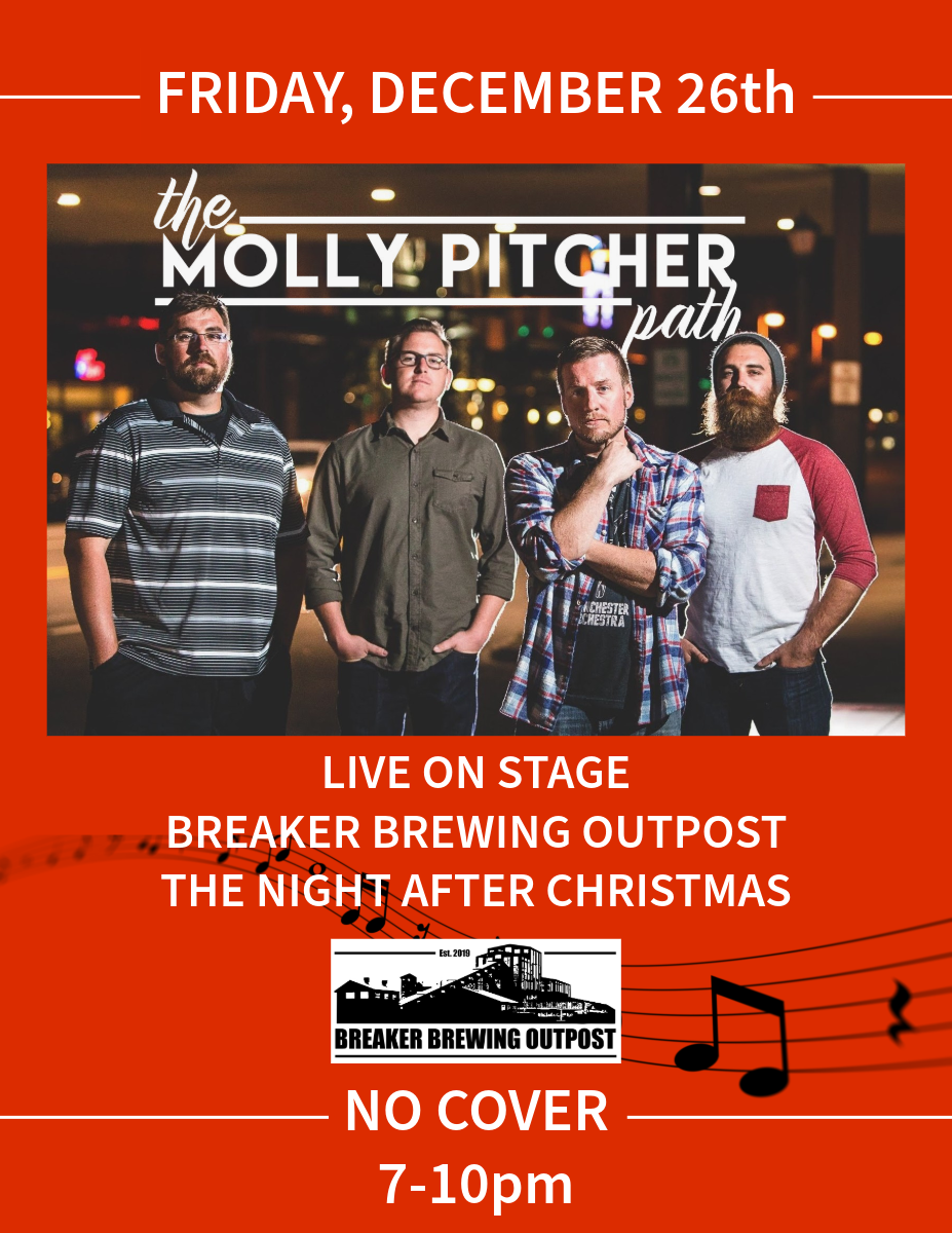 The Molly Pitcher Path are back the night after Christmas only at Breaker Brewing Outpost in Archbald. Join us Friday, December 26th, from 7-10pm for incredible live music from these local favorites.