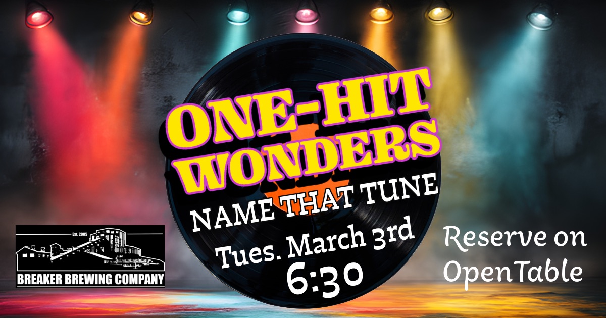 Breaker Brewing Company Wilkes-Barre TwpOne-Hit Wonders Name that Tune (60’s-90’s) Tuesday, March 3rd, 6:30 Breaker Brewing Company 787 E. Northampton St. Wilkes-Barre TWP PA ***family friendly ***free to play with purchase of food and beverage *Due to popular demand, RESERVATIONS are REQUIRED and can be made by calling Breaker directly at (570)392-9078! Please mention you're coming for the trivia!...