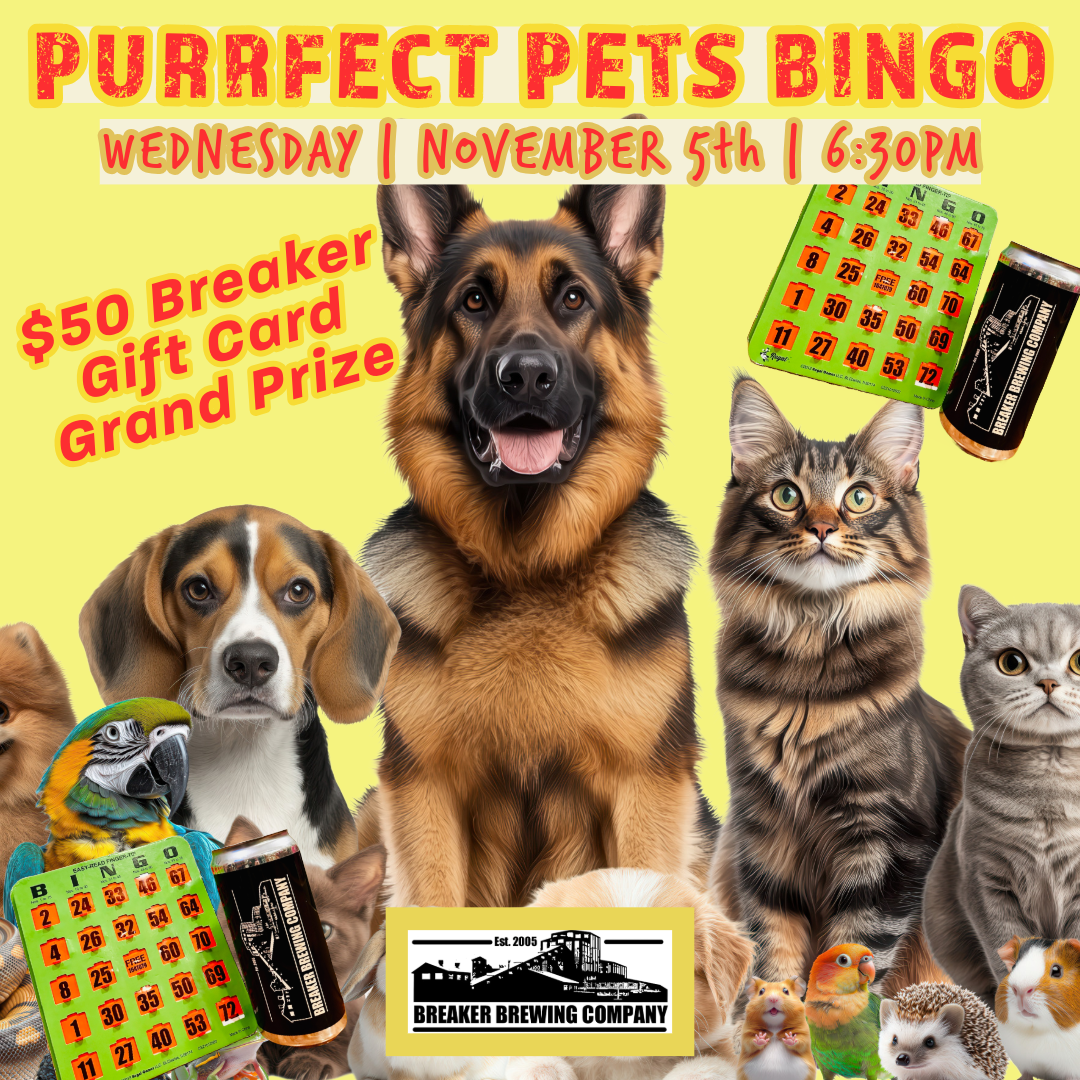 Breaker Brewing Company Wilkes-Barre TwpLet’s pamper our pets with PURRfect Pets Bingo at the Brewery, Wednesday, November 5th, starting at 6:30pm with Bingo Joe 570. Pet themed bingo with purrfect pet themed prizes! Plus, play to win the grand prize $50 Breaker gift card. special pet themed prizes $50 Breaker gift card grand prize giveaway!!! family friendly a winner...
